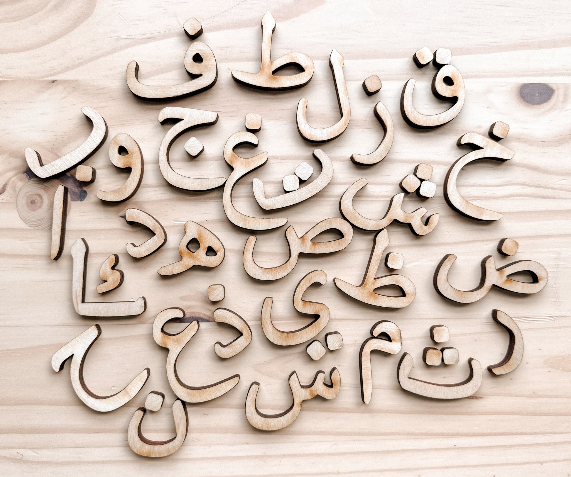 A set of 28 loose letters in the Arabic alphabet. Letters are packaged in a cotton pouch for easy storage.