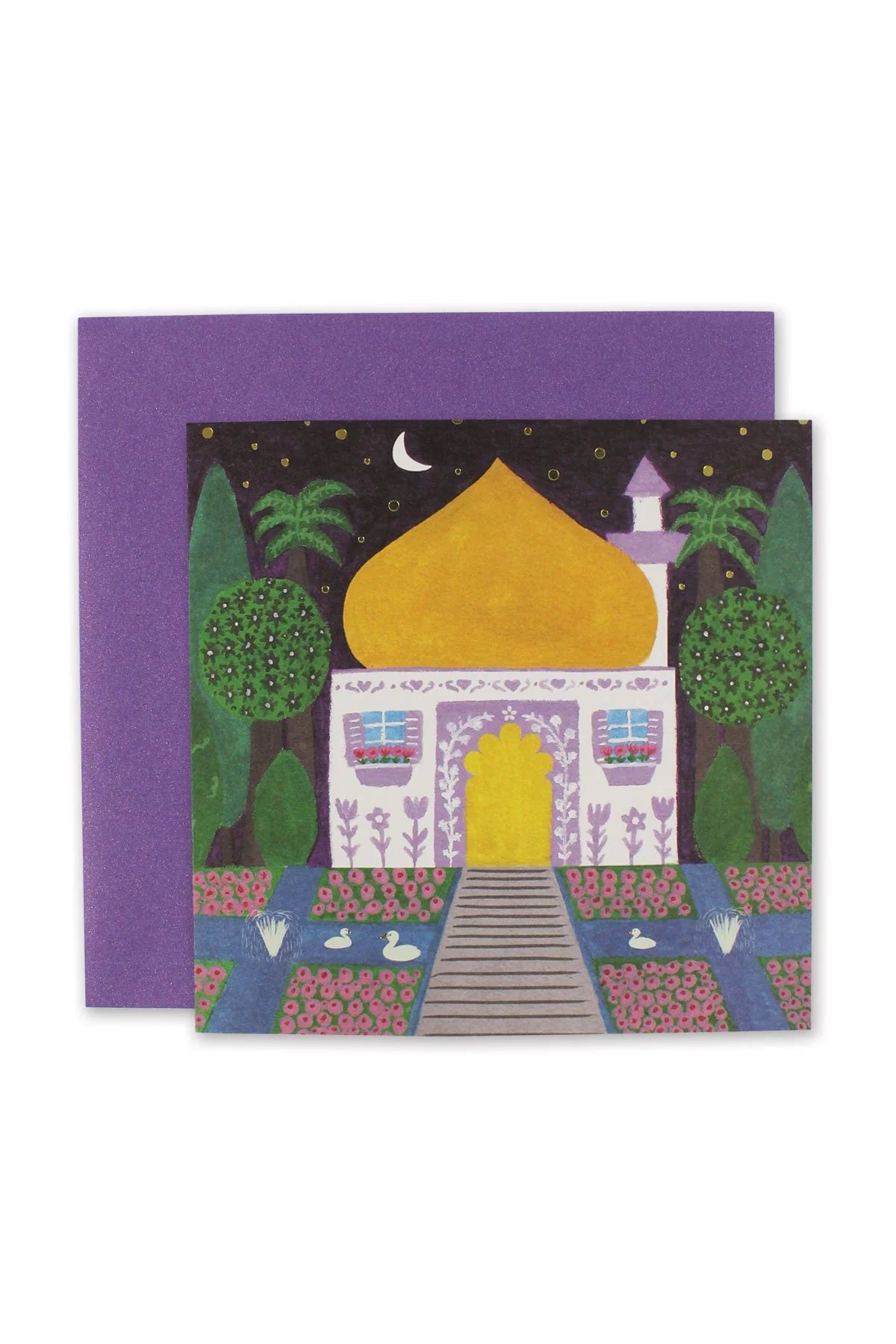 Inspired by 16th century Mughal miniature paintings, this lovely hand painted mosque with a traditional mosque garden make for a serene card to gift this holiday.